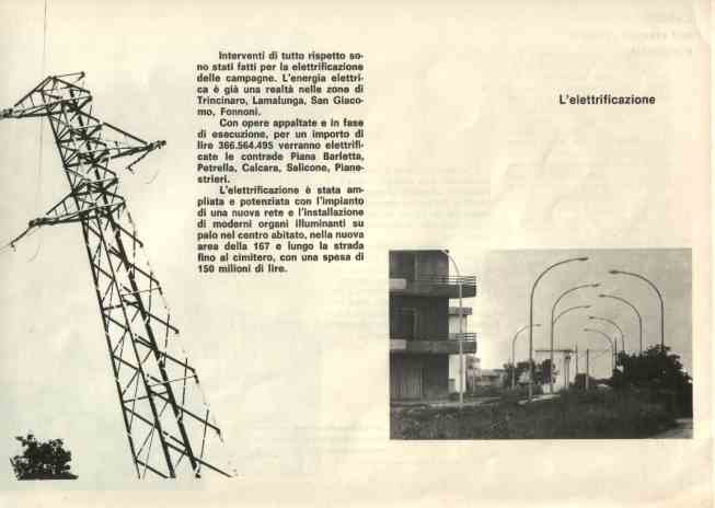 L'elettrificazione è stata ampliata e potenziata con l'impianto di una nuova rete e l'installazione di moderni organi illuminanti su palo nel centro abitato, nuova area della 167 e lungo la strada fino al cimitero, con una spesa di 150 milioni di lire.