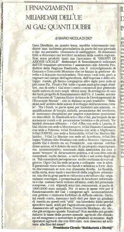 Caro direttore, su questo tema, sarebbe interessante condurre una inchiesta giornalistica da parte del suo giornale e mi permetto vivamente di caldeggiare. Si chiamano GAL e dimorano nei territori montani della nostra regione. Non sono prodotti tipici ma l'acronimo di "GRUPPI DI AZIONE LOCALE" destinatari di finanziamenti milionari dell'UE transitati attraverso l'assessorato alle Attività Produttive della Regione Basilicata, con il coinvolgimento di Comuni e Comunità Montane che ne hanno la gestione diretta e il dominio incontrastato. Non sono i soli enti, però a regnare nel campo dell'agricoltura, dell'impresa e dello sviluppo rurale, gli fanno compagnia altre sigle poco note ai più come Pir, Prust, Psl: Tutte o quasi analoghe negli obiettivi, ma di certo i Gal sono i meno conosciuti pur gestendo molti milioni di euro negli ultimi anni. Si avvalgono di uno dei tanti progetti di finaziamento dell'UE, il Leader, acronimo francese di "Liasons Entre Actions de Developpement de l'Economie Rurale"; che in italiano si può tradurre_ "Relazione nell'ambito delle azioni di sviluppo dell'economia rurale". Tra i fondi, in parte spesi per incentivi alle aziende, riqualificazione di borghi antichi, promozione del territorio, si insinuano elargizioni per pagare consulenze quantomeno discutibili. In Basilicata sono otto i GAL partecipati da associazioni rurali e di promozione turistica e da privati. Volendoli elencare abbiamo: