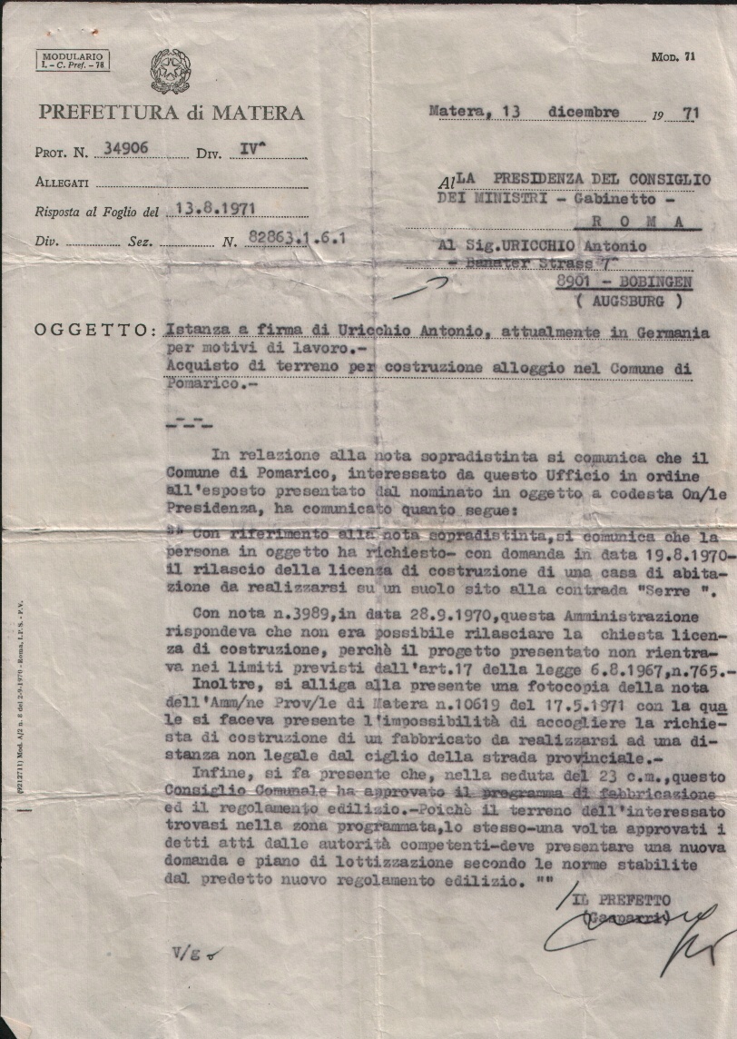 ALLORA: DOPO L'ESITO NEGATIVO DEL COMUNE DI POMARICO DI RILASCIARE UNA LICENZA DI COSTRUZIONE PER UNA CASA NEL 1971 IL PREFETTO DI MATERA, RISPONDE AD UNA RICHIESTA DI CHIARIMENTO DA PARTE DELLA PRESIDENZA DEL CONSIGLIO DEI MINISTRI