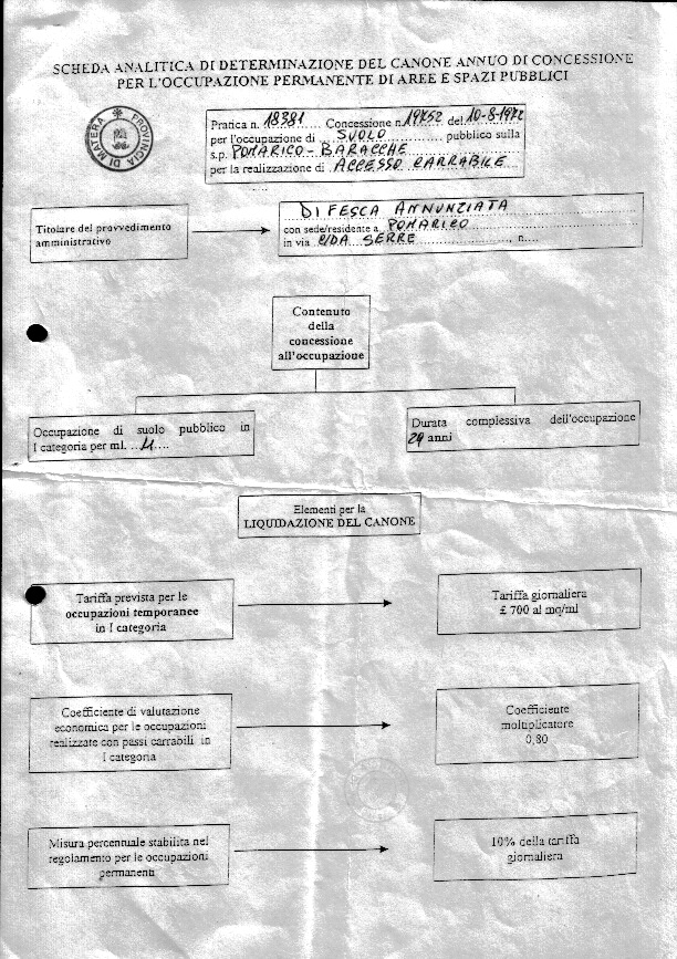 Guardate e stupite ! Anno 2000. Dopo aver demolito l'accesso carrabile, la stessa Provincia di Matera riconferma la pratica e il canone da pagare. - L'occupazione dura da 29 anni !