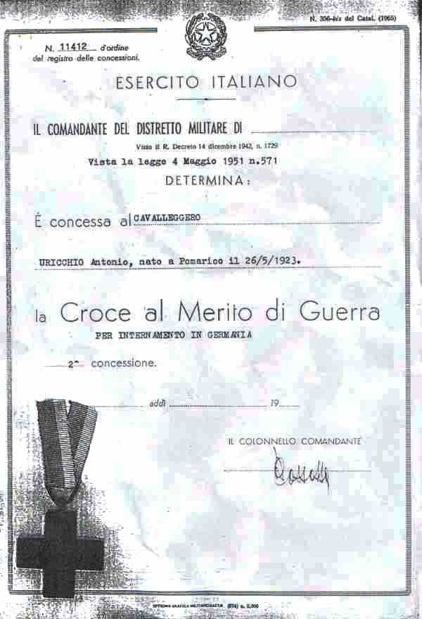 Prestare servizio militare costituisce un massimo atto di patriotismo, essere stato decorato per meriti di guerra lo è ancora di più. Invitiamo tutti gli italiani a riflettere sul loro impegno eroico per la "PATRIA", perchè , non necessariamente lo Stato si dimostra riconoscente in tale caso. Nel caso della numerosa famiglia Uricchio e del suo capo famiglia, non solo non ha potuto oppure voluto essere previdente per corrispondere agli obblighi costituzionali, constringendolo all'emigrazione con la sua intera famiglia, anzi , questo veniva poi derubato dallo stesso Stato del suo bene guadagnato con il lavoro in Germania e messo con azioni meschine economicamente in ginocchio. E con la strada "ammodernata" in modo fuorilegge, fuori norma e pericolosa - in casa sua ! - è diventato vittima di un "incidente" ! Ahi, Stato Italiano ! Ingrato, ladruccolo e mafioso.