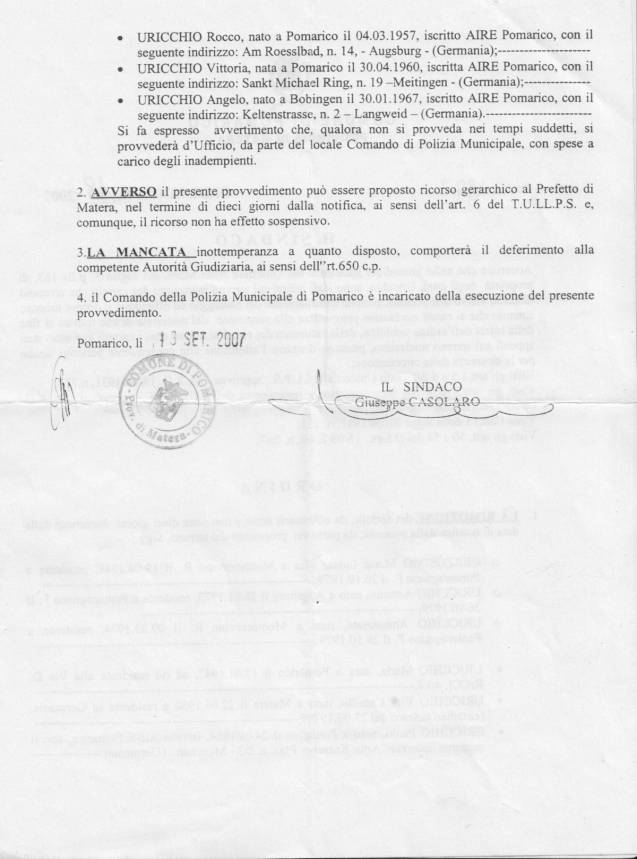Pomarico continua il 2007 a scrivere ordinanze contro la famiglia Uricchio, e