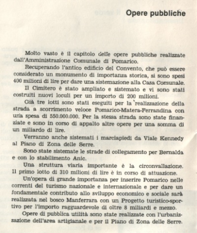 E nasce la LEGGE 167, del 1962, per creare questo nuovo CENTRO anche a POMARICO. Arriva così una fitta pioggia di finanziamenti e di miliardi (Nota: Che a Pomarico, come in tutta la zona, verranno rubati e bruciati dai nuovi padroni, alias "amministratori" !!)