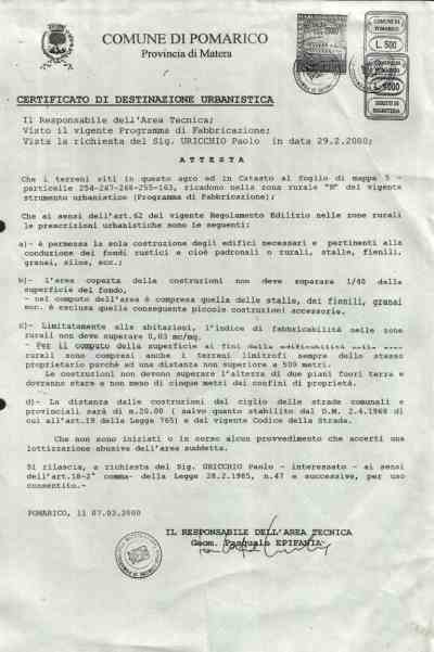 In assenza di un PIANO REGOLATORE a POMARICO (MT), il "SINDACO" e i suoi "AMICI" in queste zone decidono: Tu si, tu no ! In pratica, come nel famoso film "IL PADRINO" ci si rimette alla BENEVOLENZA e alla GRAZIA del SINDACO. Appropriazione indebita, reati contro il patrimonio, falso in atti d'ufficio, frode alle casse pubbliche, elevata energia criminale ecc.ecc. Quindi reati teoricamente anche in ITALIA perseguibili per LEGGE, a Pomarico non vengono perseguiti, perchè quì si usa fare e operare così in "funzione pubblica", in poche parole: Rubare, commettere reati, scrivere il falso !
