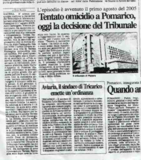Guardate: Questi articoli sono apparsi, di recente, su "LA GAZZETTA DEL MEZZOGIORNO", un quotidiano della zona. Tutte le persone menzionate in questi articoli abitano nelle case sociali a Pomarico. Nessuno paga l'affitto, perchè, giustamente, l'affitto è basato sul reddito. Quindi .... nessuno ha un reddito da dichiarare. Però guardate il parco AUTO parcheggiate sotto le case sociali a Pomarico: