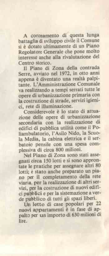 Si legge: A CORONAMENTO di sviluppo civile il COMUNE si è dotato ultimamente di un PIANO REGOLATORE GENERALE che pone molto interesse anche alla rivalutazione del CENTRO STORICO..... (Nota: La facciata !)