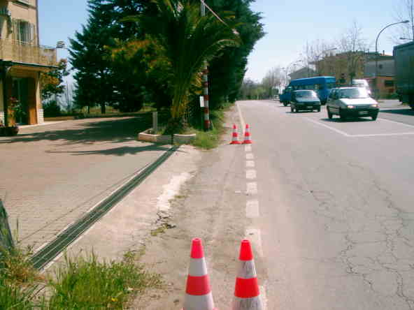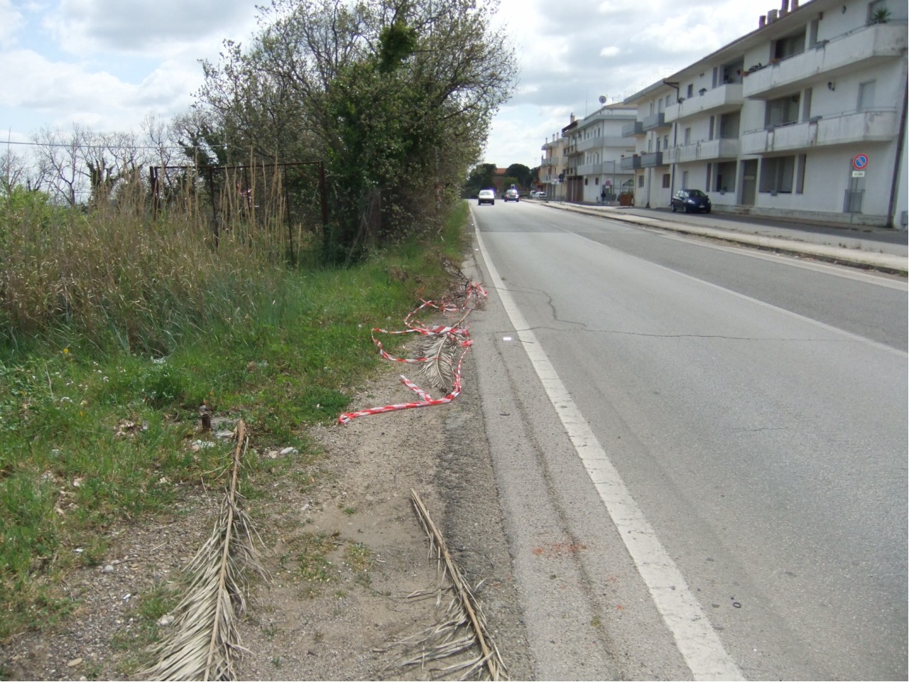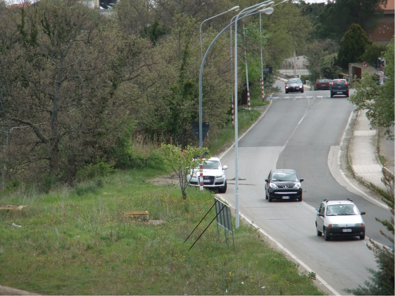 Rispetto alla direzione centro città - periferia, al margine destro della carreggiata non vi è marciapiede in rilevato ma solo ciglio erboso sul quale insistono pali dell'illuminazione pubblica distanti dal nastro di asfalto mediamente di circa un metro.