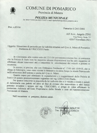 In riferimento alla vostra nota del 23/1/06 pervenuta a mezzo fax, si comunica che la Polizia di Stato non ha impartito alcuna disposizione ma ha solo suggerito (! Ma cosa doveva fare la Polizia di Stato ? Sbattere dentro il Sindaco e di tecnici che hanno progettato ed approvato questo scempio oppure fare un lavaggio di cervello a chi si ritiene responsabile della sicurezza stradale a Pomarico ?) di effettuare alcuni interventi atti a consentire la circolazione dei veicoli e pedoni in sicurezza.
