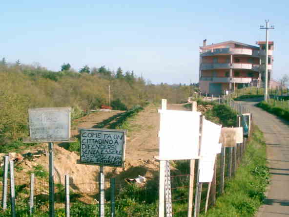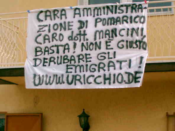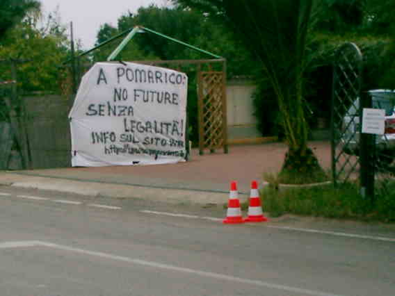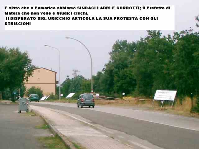 E visto quindi che a Pomarico abbiamo SINDACI LADRI e MAFIOSI, il PREFETTO CHE NON CONTROLLA, l'opposizione che non articola parola e il GIUDICE "designato" cieco, il Sig. Paolo Uricchio è costretto ad articolare la sua protesta contro questo modo di "amministrare", fissando gli striscioni lungo la rimanenza della proprietà acquistata a Pomarico. Era questo lo scopo ? Veramente, noi acquistando quella proprietà ci siamo fidati della LEGGE e dei DIRITTI. Avevamo buone intenzioni. Avendo acquistato e costruito la palazzina, volevamo mettere in piedi un'attività. Lavorare svolgendo lavoro autonomo. Sviluppare i luoghi ! Tutto questo in queste zone non è possibile, se i mafiosi in "FUNZIONE PUBBLICA" sono contrari oppure non ne traggono dei profitti personali immediati.