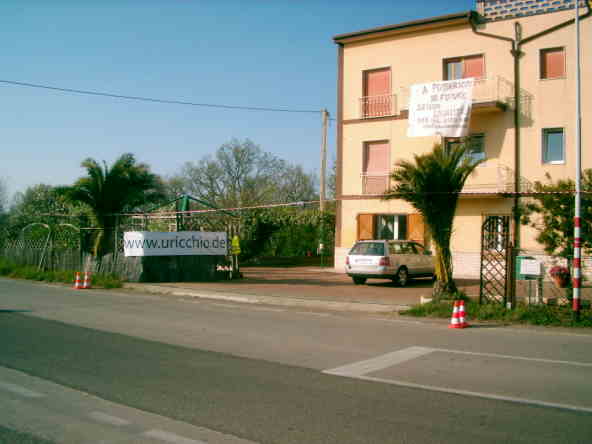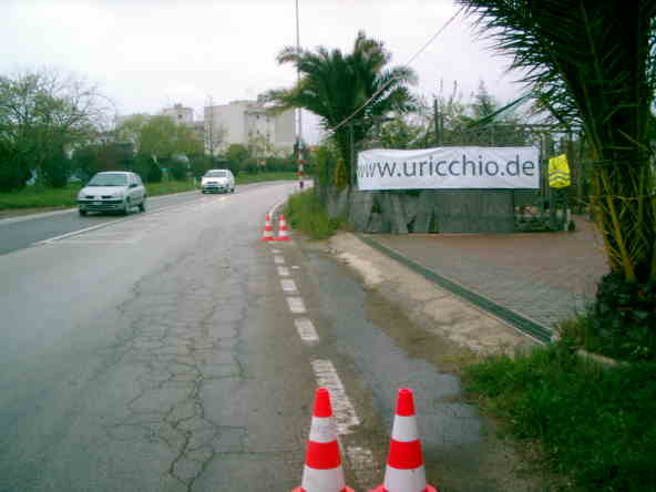 Guardate: In queste zone le "misure di sicurezza" per le CORSE DI GO-CART svolte al centro strada e volute dal SINDACO e "AMICI" di POMARICO, sono limitate al nastro di plastica ed a quattro fusti di paglia. La famiglia Uricchio, durante queste feste, deve "proteggersi" poggiando i birilli sulla "presunta strada provinciale ammodernata" in casa loro.