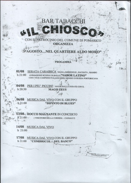 Si legge: BAR TABACCHI "IL CHIOSCO" con il PATROCINIO DEL COMUNE DI POMARICO organizza