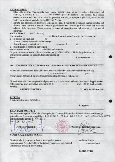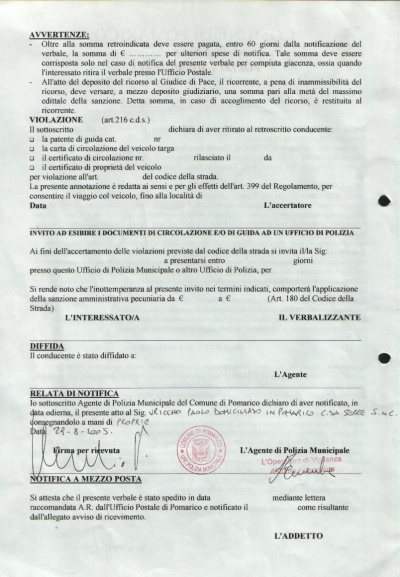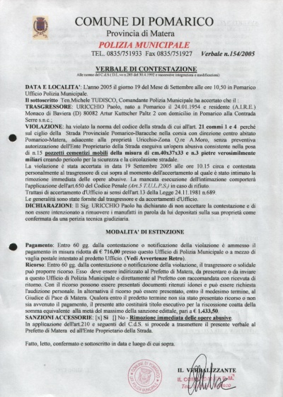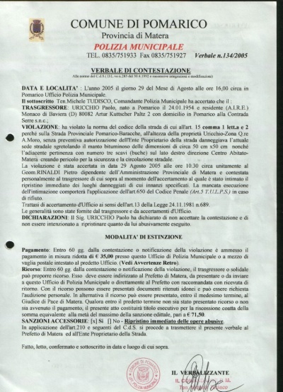 A detta del braccio operativo del SINDACO DI POMARICO, Tenente Michele TUDISCO, il Sig. Uricchio, fissando dei paletti e dei blocchetti per cercare di proteggere la famiglia URICCHIO e la rimanenza della proprietà acquistata a Pomarico, ha recato un pericolo alla viabilità e violato il codice della STRADA. Il Sig. Uricchio deve perciò presentare ricorso tramite i suoi avvocati contro questi verbali inammissibili e stupidi. Anche se con tale ricorso viene chiesto al giudice che questo ricorso si riferisce contro "... qualsiasi atto consegutivo e configurabile con quello impugnato", il GIUDICE SI GUARDA IL PAVIMENTO, fa finta di non capire, nonvede e non decide e il Sig. Tudisco a questo punto continua ad emettere nuovi verbali con la stessissima motivazione.